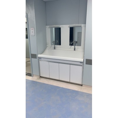 高分子洗手池材质特点:采用高分子材料一次吸塑成型,出水方式有:感应式、膝控式、脚踏式和手动开关,一台洗手池可客户要求选择单一出水方式或多种出水方式。洗手池分高背和低背,高背总高度1800mm,配有美容镜,照明灯,皂液器,可按客户要求配置烘手器和热水器。低背板无配置。
