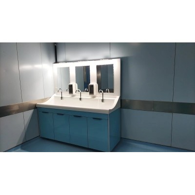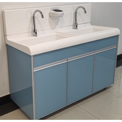 高分子洗手池材质特点:采用高分子材料一次吸塑成型,出水方式有:感应式、膝控式、脚踏式和手动开关,一台洗手池可客户要求选择单一出水方式或多种出水方式。洗手池分高背和低背,高背总高度1800mm,配有美容镜,照明灯,皂液器,可按客户要求配置烘手器和热水器。低背板无配置。